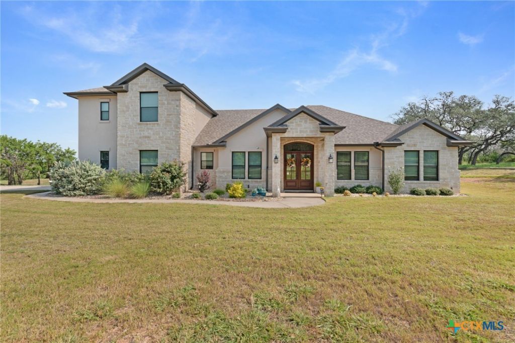 Welcome to one of the most breathtaking Hill Country view properties in 7 Creeks Ranch. This exceptional four-bedroom, three-and-a-half-bath luxury residence offers over 3,100 square feet of thoughtfully designed living space, set on 6 wildlife-exempt acres that perfectly balance privacy, panoramic scenery, and community living. Built with quality craftsmanship and enduring value, this well-appointed home showcases refined details throughout. Solid oak built-in cabinetry enhances both the living room and downstairs office, reflecting timeless elegance and functionality. The spacious kitchen is designed for both everyday living and entertaining, featuring black stainless steel appliances, generous slow close cabinet and drawer storage, and a seamless flow into the main living areas. The primary suite is a private sanctuary, offering comfort and tranquility, while three additional bedrooms and two and a half bathrooms provide flexible space for family, guests, or a home office setup. Step outside and experience the true beauty of Hill Country living. Enjoy sweeping countryside views, mature hardwood trees, and a stocked private pond that adds both charm and recreation. The covered back patio, complete with built-in speakers, is perfect for morning coffee, sunset gatherings, or relaxing evenings under the stars. A custom-designed swimming pool elevates the outdoor experience and creates an ideal space for relaxing or entertaining. Additional features include a 30' x 40' barn, an insulated pump house, and the benefits of a wildlife tax exemption. Located within the welcoming, gated 7 Creeks Ranch community, residents enjoy friendly neighbors, a boutique winery just outside the gates, and unforgettable night skies filled with stars. More than a home, this is a refined Hill Country lifestyle?where luxury, nature, and comfort come together. Welcome home.