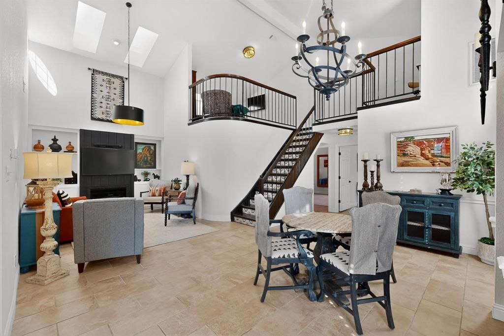 Stunning, completely updated zero-lot-line home with designer finishes and a private, park-like courtyard! From the moment you enter, you’re greeted by grand two-story ceilings that create an airy, luxurious feel—carried beautifully into the kitchen with its own soaring two-story ceiling.The heart of the home is the show stopping kitchen featuring custom cabinetry painted a rich turquoise, accented with gold hardware, quartz countertops, and plantation shutter for the perfect designer touch. The downstairs is finished with gorgeous neutral tile flooring, while the upstairs loft boasts brand-new carpet, making every space feel fresh and move-in ready.The primary suite is a true retreat with a dramatic cathedral ceiling and a spa like ensuite with a astounding black soaking tub, separate shower, dual sinks, all complemented by a quartz countertop. Every detail has been thoughtfully curated—from the custom drapes to the statement designer lighting that adds personality and elegance in every room. Cozy up by the wood-burning fireplace, beautifully framed by built-in cabinetry, or admire the stunning designer tile staircase that feels straight out of a magazine. The spacious loft offers incredible flexibility—perfect as a second living area, office, or even an additional bedroom space. The guest bedroom features a soaring cathedral ceiling and a large window that fills the space with natural light and finished with a beautiful designer light fixture. Just outside the room, a recently remodeled guest bath offers a stylish walk-in shower, quartz counters and the rich turquoise cabinet color. Enjoy the outdoors in your beautiful courtyard with a covered arbor, offering a peaceful, park-like setting ideal for relaxing or entertaining. Community amenities include a pool, and the location is unbeatable—just minutes from Bedford Boys Ranch Complex. Generous room sizes, cathedral ceilings, and designer upgrades throughout—this home is truly one-of-a-kind.