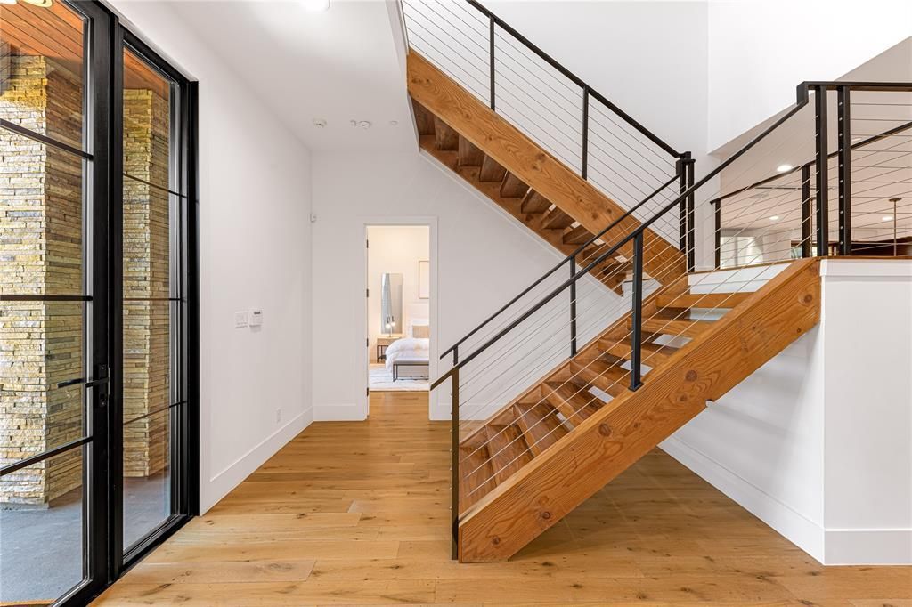 Step into luxury living with this architectural gem on an expansive 70’-wide lot in University Park—tucked behind the wall on a quiet cul-de-sac street, just a short walk to Boone Elementary in HPISD. Custom-built by Anderson Homes, this transitional modern showplace is the ultimate expression of luxury, design and craftsmanship. A dramatic La Cantina glass entry leads to soaring ceilings, natural textures, and sleek architectural lines—flooded with natural light and layered in rich designer detail. Every element is curated: from the 6” white oak floors and Jeld-Wen wood-clad windows and doors to walnut-accented cabinetry, quartz and porcelain tile surfaces and designer lighting. The seamless indoor-outdoor flow elevates both daily living and entertaining. At the heart of the home, the open-concept great room is anchored by a sleek linear fireplace and a dramatic Restoration Hardware chandelier—framed by sliding glass doors that open wide to the terrace and backyard oasis beyond. This intentional indoor-outdoor connection transforms the space, merging relaxed elegance with effortless entertaining. The great room flows into a chef’s kitchen–complete with oversized quartz waterfall island, premium Thermador appliances, custom cabinetry, and a sunlit dining area. Also on the main level: a serene primary suite with a spa-worthy bath and boutique-style walk-in closet, a private guest suite, and a dedicated study. Upstairs, three spacious ensuite bedrooms connect to a large game room with wet bar and sliding doors to a covered balcony—an elevated retreat for morning coffee or evening cocktails–and a media room offers the ultimate cinematic experience. The illuminated backyard—designed by Radiant Gardens and Southern Botanical—is a private retreat with a covered terrace and open patio with cedar-shaded arbor, dramatic trickling wall fountain, and a turfed lawn ready for a future pool. Rare in both scale and sophistication, this home defines luxury in the heart of HPISD.