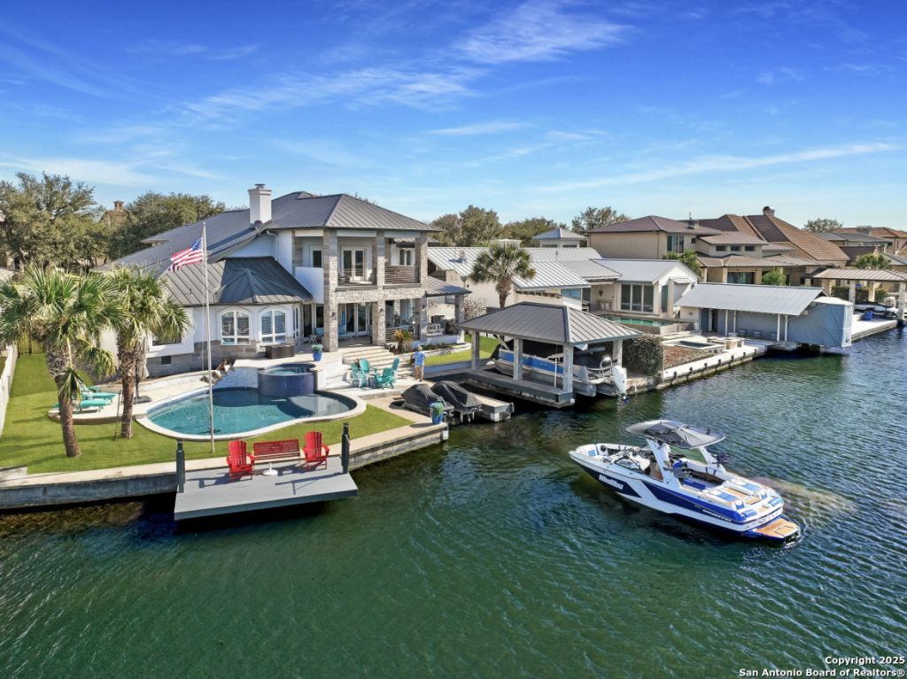 Matern Island isnt just a place - its a lifestyle. This 0.33-acre estate boasts 100 feet of prime Lake LBJ shoreline in one of Horseshoe Bays most coveted communities. Start mornings with coffee on the Trex deck and spend afternoons on the water with your private boat slip, electric lift, and 2 jet ski lifts. Prefer dry land? Relax by the in-ground pool, spa, and splash pad, or gather around the stone patios gas fireplace for golden-hour views. Built-in speakers keep the vibes flowing, indoors and out. Inside, lakeside luxury takes center stage. The living rooms floor-to-ceiling windows frame panoramic water views, while the stone wood-burning fireplace and built-in audio system set the mood. The kitchen is a chefs dream with a Z-Line 6-burner gas stovetop, granite island, and wine bar perfect for entertaining. The main-level owners suite is a private sanctuary with unobstructed lake views, private patio access, and a spa-inspired bath featuring an oversized soaking tub, walk-in shower, and a custom closet perfect for any wardrobe. Upstairs, guests enjoy lake-view suites and a family room with direct balcony access overlooking the lake - the perfect spot to unwind after a day on the water. With gated community privacy, meticulous landscaping, and smart home features - plus Horseshoe Bay Resort just minutes away - this home delivers the ultimate lake life. Why dream it? Live it. Lets get you on the water!