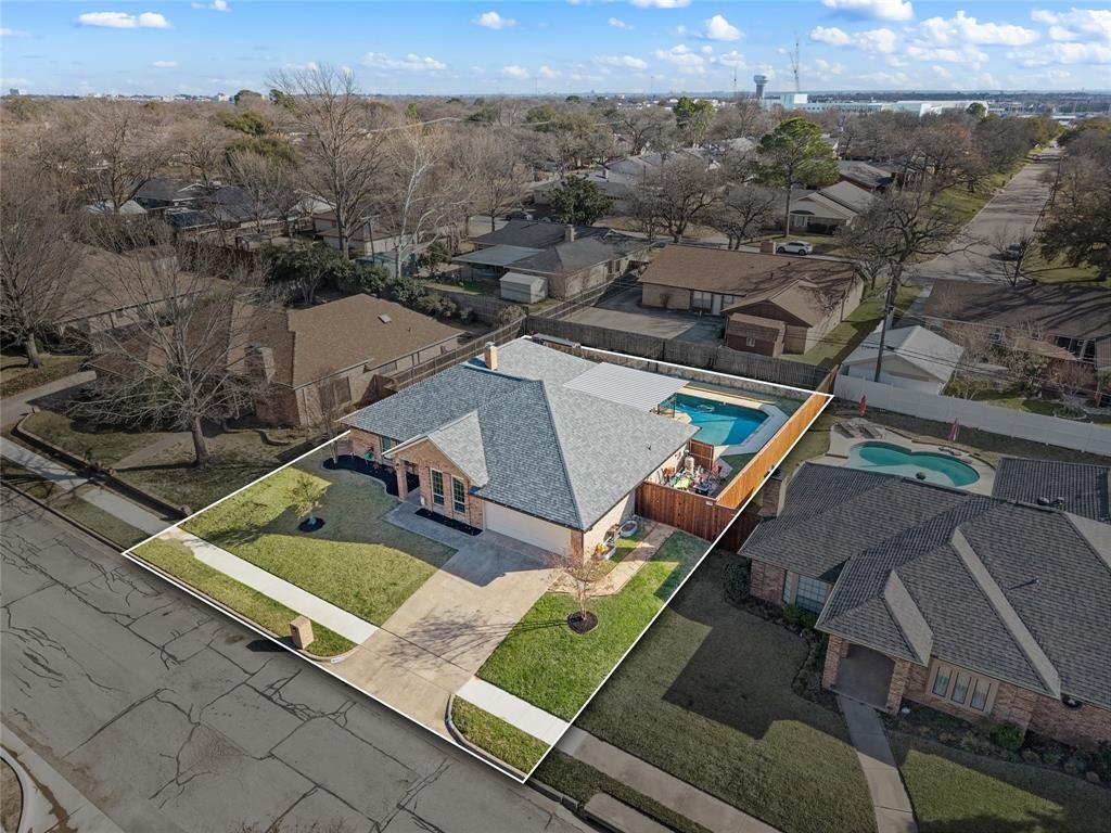 Multiple offers received. Please submit highest and best by Monday at 9:00 AM. Charming single-story home in the desirable Mayfair Addition, zoned to highly sought-after HEB ISD—home of the Blue Raiders. This well-maintained 4-bedroom, 2-bath home also features a dedicated office, offering the flexibility buyers are looking for. The thoughtfully designed floor plan provides spacious living and dining areas that flow easily for both everyday living and entertaining. The private primary suite is tucked away for added comfort, while the additional bedrooms offer great space for family, guests, or hobbies. Step outside to your own backyard retreat complete with a sparkling pool and wrought iron safety gate—perfect for relaxing evenings or hosting gatherings. There’s still plenty of yard space to enjoy, making it ideal for play or pets. Located with convenient access to Highways 183 and 820, and just minutes from Generations Park, shopping, dining, and entertainment along Colleyville Blvd. A wonderful opportunity in a prime location! Enjoy added peace of mind with major updates already completed, including the roof, windows, new pool pump, patio cover, and wood ceramic tile flooring throughout the home.