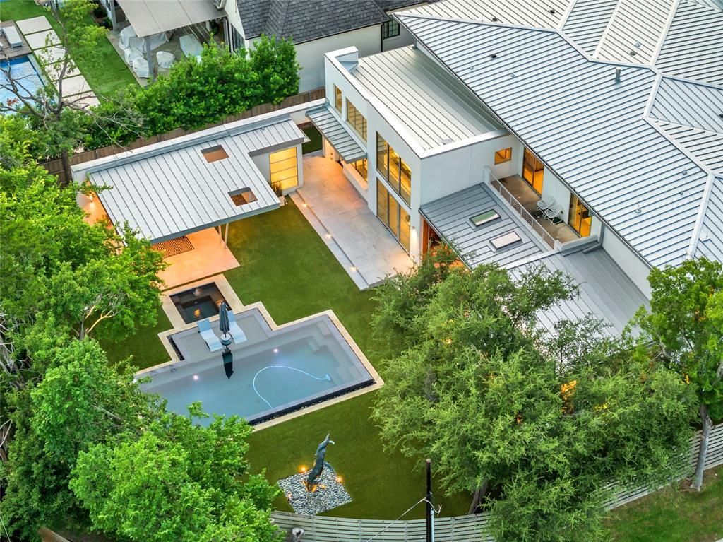 In the heart of the Fairway of Preston Hollow, this striking modernist home blends architectural drama with everyday comfort. Designed for both lively entertaining and relaxed family living, its open, light-filled spaces flow effortlessly to the outdoors. Retractable screens create a seamless extension of the main level, opening to 800+ square feet of covered living space. A second outdoor lounge channels mid-century charm with a fire pit beside a striking $400K negative edge pool, hot tub, and tanning ledge—set against a lush, turfed play yard. Inside, soaring ceilings with exposed steel beams and custom finishes define the expansive main level, where a serene primary suite and media room offer retreat. Upstairs, four bedrooms surround a central living area with balcony and bar, while two flex spaces—including a gym with laundry—adapt to any lifestyle. Three-car garage and standing seam metal roof. 2026 updates include: all wood floors professionally refinished, interior walls freshly repainted, stucco refinished, new air conditioning unit installed, pool pump replaced, exterior wood paneling re-stained. With a Control4 system, elevator and climate-controlled wine room, this home is turnkey luxury ready for immediate occupancy.