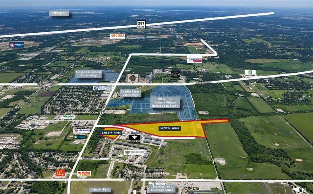 Vanguard Real Estate Advisors (“VREA”) has been exclusively retained by Ownership to offer the opportunity to purchase two development Sites located at 8932 Balch Street, 9128 Crimson Lane, 9105 Azure Lane, and 9501 South Race Street in Fort Worth, TX. These sites can be bought together or separately. This offering has a concept plan for 372 dwelling units—120 units on the North Site (5.068+- acres and zoned for multifamily) and 252 units on the South Site (30.99+- acres and zoned for townhomes). Both Sites are located just 2 miles east of Interstate 35 and 2.5 miles south of Interstate 20, two major thoroughfares that provide excellent accessibility. These Sites are located near key community amenities including Everman High School and Johnson Park, adding to their appeal for future residents. A hub of the south central Tarrant County industrial submarket is located a mile west from the Sites, giving future residents excellent employment opportunities. With pricing at just $3.75 per square foot for the North Site and $1.50 per square foot for the South Site, this is a great opportunity to acquire well-located entitled land in a high-demand area.