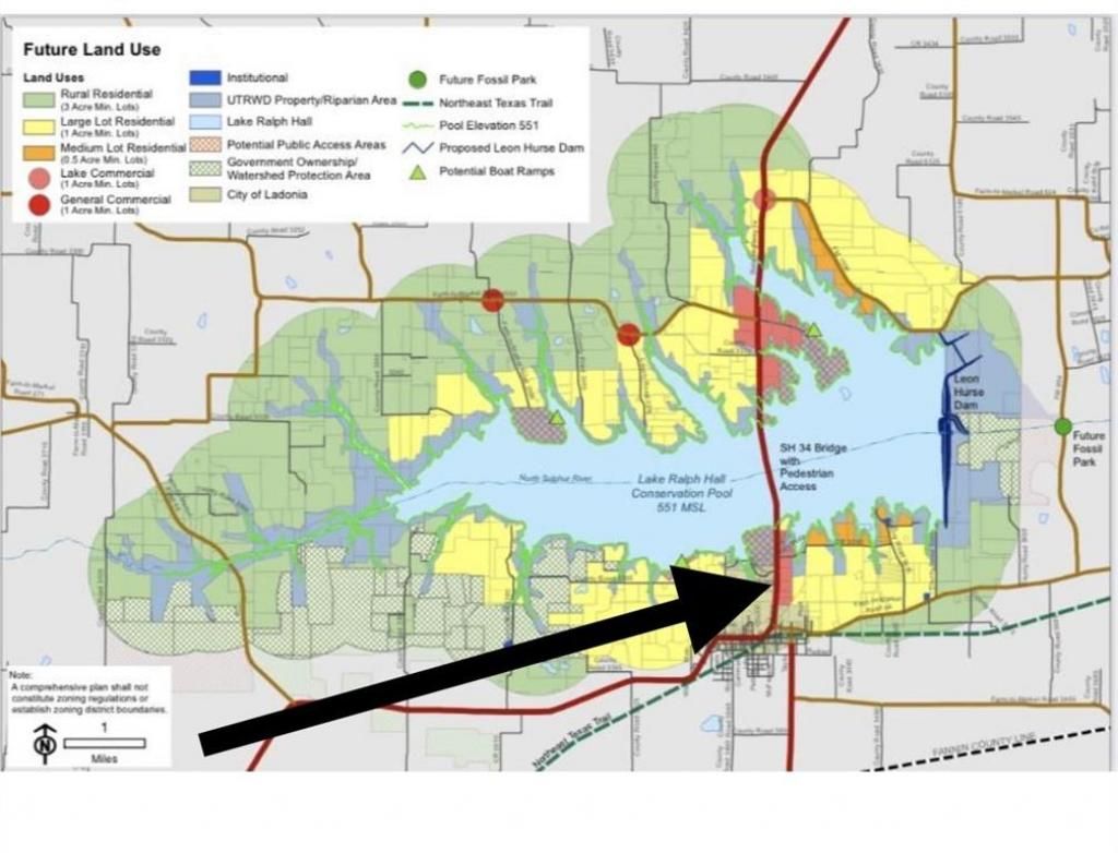 Zoning of Future Land Use for this property is Lake Commercial, 166 feet frontage on TX-34 and 631 feet frontage of overlooking Lake Ralph Hall.